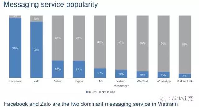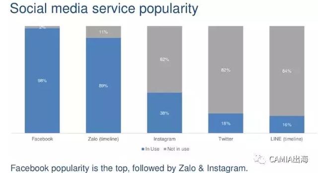 Facebook,Zalo和和Ins为越南市场三大社交使用。此中Facebook的渗入率很是高。Twitter和LINE也有不罕用户。