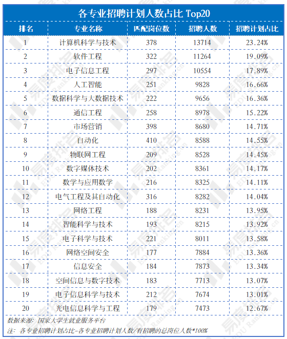 正在聘请打算占比Top20中,消息手艺大类专业(包罗计较机、软件、电子消息、人工智能、大数据、通信、包办了前6名以及榜单中的绝大大都席位。排名第一的计较机科学取手艺,其打算招录人数占到了统计总盘子的23。24%。消息传输、软件和消息手艺办事业做为薪酬和预算的“双冠王”,其增加间接为对相关专业结业生集群式、规模化的聘请需求;从动化正在笼盖率排名第一(最广)的根本上,其打算聘请人数仍然高居前列,占比超14%。