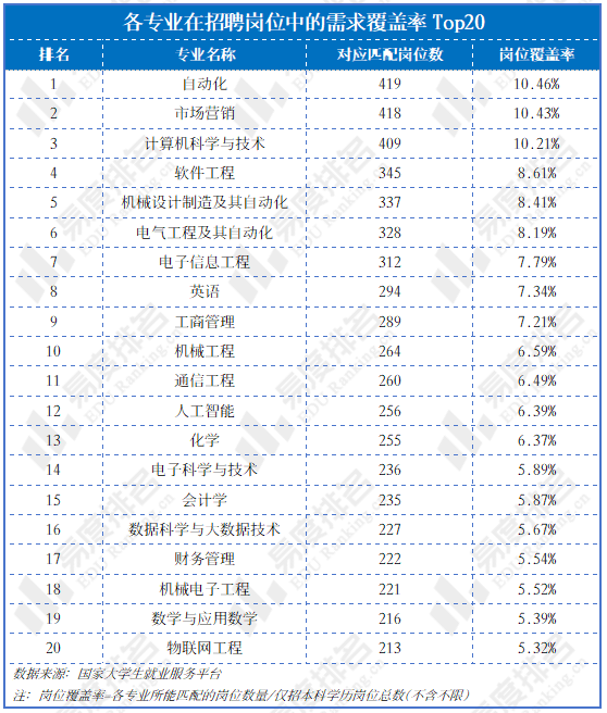 岗亭笼盖率即某一专业所能婚配的岗亭数量占全数有明白专业要求岗亭总量(仅统计本科学历)的比例。岗亭笼盖率前十名中,工科专业占领六席。Top20专业大致能够分为四个集群:数字经济取消息手艺集群、智能制制取从动化集群、现代商科取办理集群以及根本学科取通用技术。此中数字经济取消息手艺集群涵盖计较机科学取手艺、软件工程、电子消息工程等8个专业,数量最多。从互联网公司到制制工场,从金融机构到零售企业,都正在招募数字化人才;智能制制取从动化集群笼盖了从动化、机械设想制制及其从动化、电气工程及其从动化等5个焦点专业。此中,从动化专业位列需求榜首,这一现象清晰印证了广东省制制业当家取智能制制升级的计谋导向并非逗留正在政策标语层面,而是曾经切实为对相关范畴结业生最普遍。